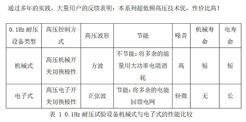 13971566988我公司新一代系列超低頻高壓發生器是采用自主研發的核心產品,采用 7 寸觸模屏、進口高速AD采集電路,以及新生產工藝。提高了儀器質量穩定性,降低了設備的體積和重量,操作簡單,克服了國內同類產品的諸多缺點(見表 1),性價比高于同類進口產品的機械式升壓器使用壽命短、故障率高、體積大的缺點。相較于其他幾種耐壓試驗設備方式而言,0.1Hz超低頻具有諸多優點,如表2。