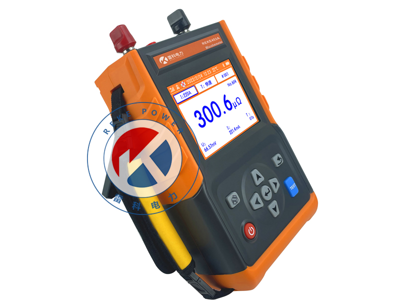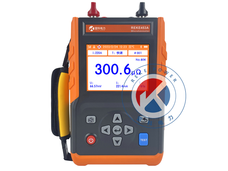 REKE-453A手持式回路電阻測試儀(又稱微歐計)是一款專為測量高壓開關、斷路器接觸電阻及金屬導體回路電阻而設計的精密儀器。內置高精度A/D轉換器與程控電流源,可輸出高達100A的無紋波直流電流,支持多檔位調節與定時連續測試。具備開路、過熱等多重保護,抗干擾能力強。采用5.6寸彩色LCD屏,操作簡單,便于攜帶,支持數據存儲與藍牙APP連接,可實現GPS定位、數據上傳、報告生成等功能,顯著提高現場檢測效率。
